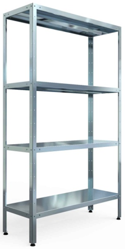 Данная модель имеет четыре полки из нержавеющей стали, каждая способна выдержать до 80 кг веса. Это достигается также благодаря наличию ребер жесткости и уголкам усиления. Вы можете регулировать высоту полок с шагом 100 мм.