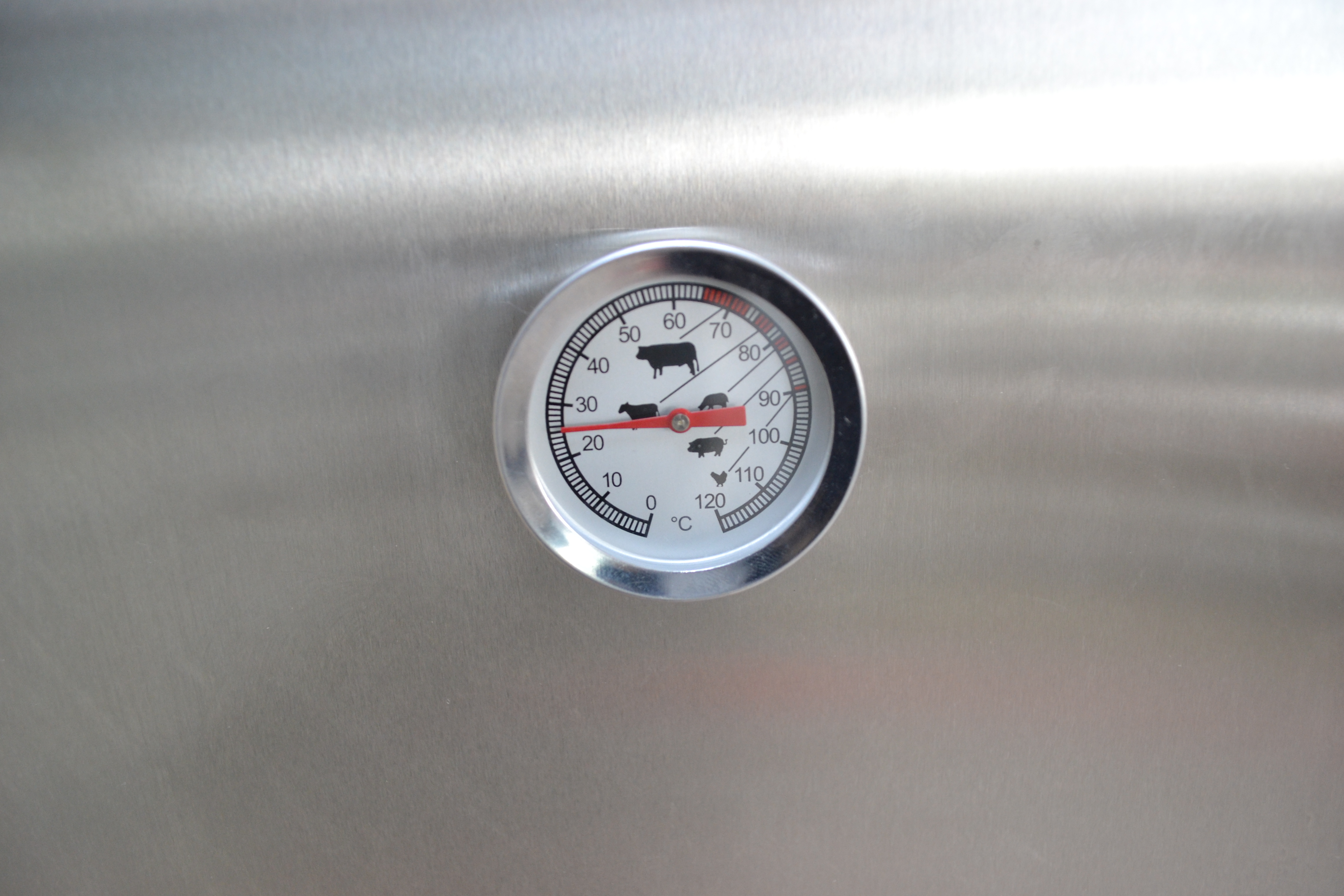Коптильный шкаф оснащён таймером и датчиком температуры. Таймер рассчитан на максимальное время приготовления – 180 минут. Капилярный терморегулятор на температурный диапазон 30-110°С.
