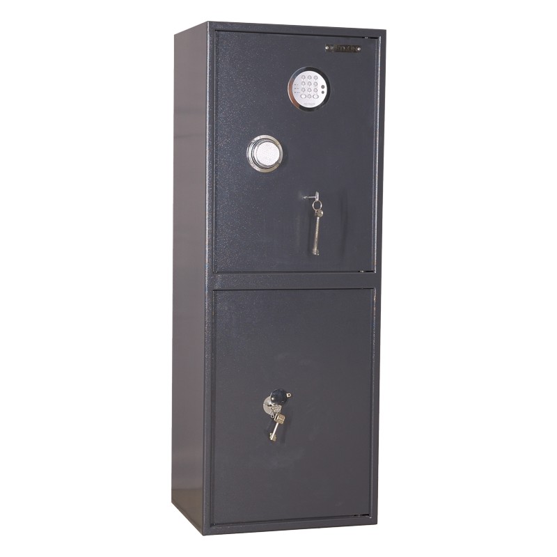 Шкаф двухсекционный, оснащен двумя съемными полками и трейзером. В двери установлен электронный замок с ригельной системой запирания и блокирующий замок. Диаметр ригеля 24 мм.