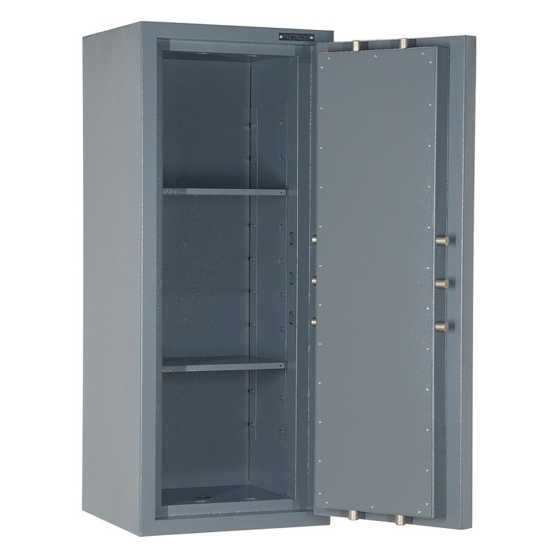 Сейф односекционный СМ(3)-120 предназначен для хранения бумажных документов и ценностей на сумму до 3 млн. руб. для физических лиц и до 800 тыс. руб. для юридических лиц. Сейф сертифицирован по ГОСТ Р 50862-2017 (п.4.1, табл.1), ГОСТ Р 51113-97 (разд. 4.1). Класс устойчивости к взлому-III (третий). Сейф односекционный, оснащен двумя съемными полками. В двери установлен ключевой замок BORDER класс А. Для облегчения процесса открытия шкафа дверь оборудована поворотной ручкой.