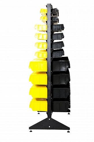 Стеллаж с пластиковыми ящиками удобное решение для магазинов и мастерских. Ящики крепятся с двух сторон. Так же данный стеллаж часто используют для хранение мелких запчастей в гаражах.