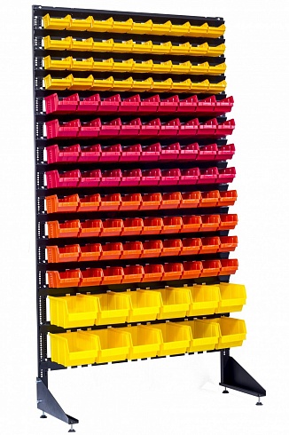 Стеллаж с пластиковыми ящиками удобное решение для магазинов и мастерских. Так же данный стеллаж часто используют для хранение мелких запчастей в гаражах.