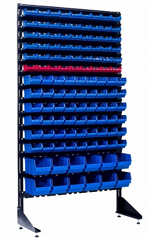 Стеллаж с пластиковыми ящиками удобное решение для магазинов и мастерских. Так же данный стеллаж часто используют для хранение мелких запчастей в гаражах.