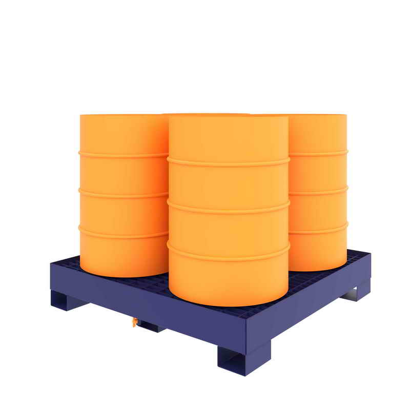 Конструкция поддона для бочек металлическая, сварная. Решетки для установки емкостей из стального листа с пазами - съемные. Для слива остатков жидкостей в дне поддона имеется резьбовое отверстие, с установленным шаровым сливным краном. Опоры коробчатой формы под погрузчик.