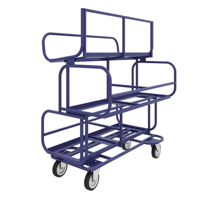 Основное применение трехъярусной тележки серии ТКЗ 200 — комплектование индивидуальных, сборных заказов. На полку устанавливается два пластиковых лотка (600х400х300 мм).